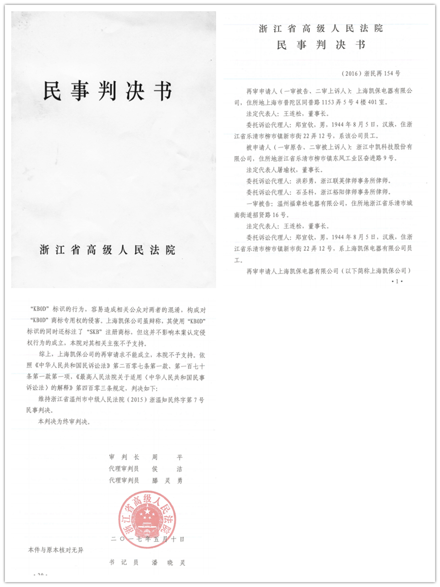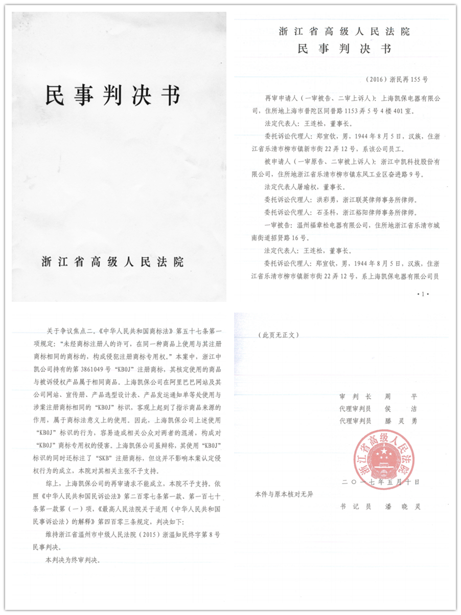 2017年5月10日,浙江省高級(jí)人民法院作出終審判決,中凱一場(chǎng)歷時(shí)三年的商標(biāo)維權(quán)案終于塵埃落定。本案得從2014年3月說起,因上海凱保長(zhǎng)期蓄意侵害中凱商標(biāo)權(quán),在產(chǎn)品包裝盒、產(chǎn)品標(biāo)牌、企業(yè)官網(wǎng)、產(chǎn)品樣本、廣告等媒介平臺(tái)上大量使用與中凱KB0、KB0J、KB0D等商標(biāo)相似或近似字樣,并有意作一些誤導(dǎo)消費(fèi)者的宣傳,被中凱訴至法院。樂清市法院受理此案后,通過大量的調(diào)查了解,以大量的事實(shí)證據(jù)為依據(jù),認(rèn)定上海凱保侵權(quán)事實(shí)成立,判令上海凱保停止侵權(quán),賠償損失。上海凱保不服,上訴到溫州市中院,溫州市中院通過對(duì)案件的審查,最終在充分的事實(shí)和證據(jù)基礎(chǔ)上作出了維持一審判決的二審判決。上海凱保為達(dá)到其不可告人的目的,使出一套“纏”和“拖”的絕技,對(duì)二審法院的判決仍然表示不服,向浙江省高院提出再審申請(qǐng)。省高院受理案件后,開庭再審該案,在大量的事實(shí)和證據(jù)面前,最終作出了維持溫州市中院二審判決的終審判決。這一判決,標(biāo)志著一些別有用心,惡意侵害或蓄意侵占中凱商標(biāo)權(quán)的不法行為的破滅。