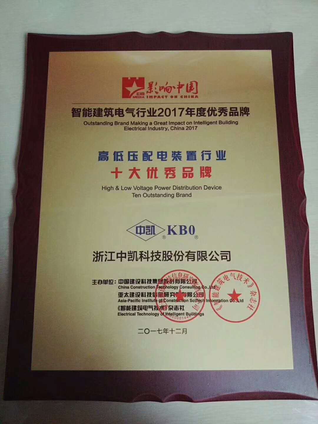 2017年12月19日,從北京傳來好消息,我浙江中凱科技股份有限公司再次被評選為2017年度影響中國智能建筑電氣行業高低壓配電裝置十大優秀品牌,這是我公司自2016年以來,連續第二次獲此殊榮。本次評選的2017年度高低壓配電裝置十大優秀品牌分別由浙江中凱和ABB、施耐德、西門子、常熟開關等業內十家領軍企業斬獲。