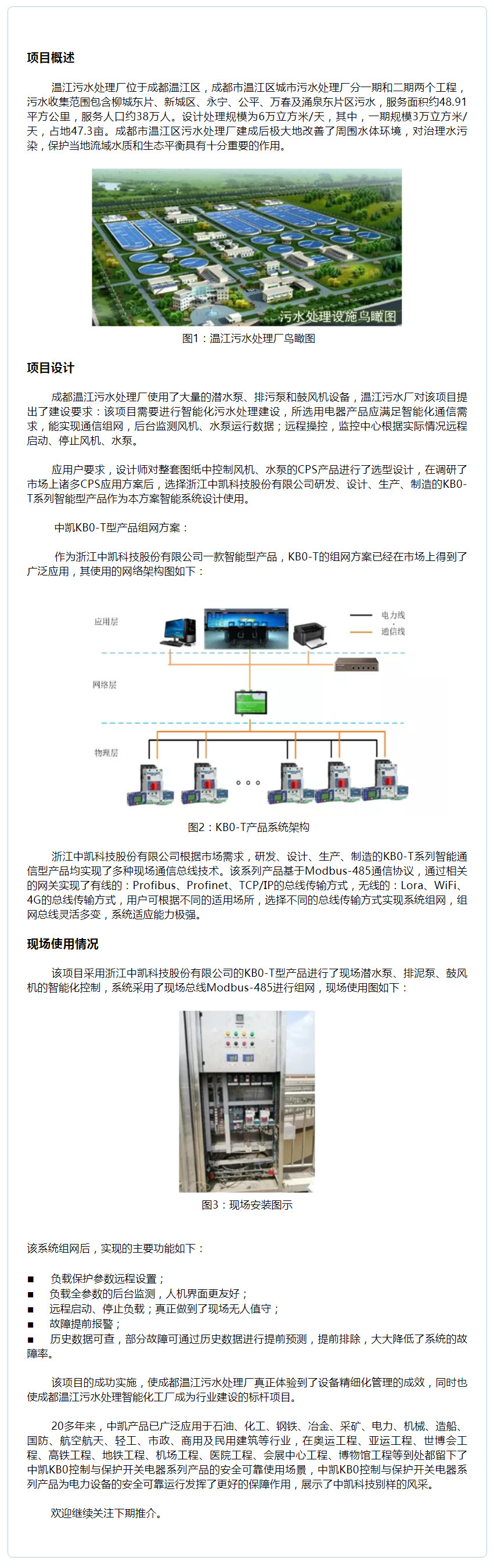 中凱KB0-T智能型產(chǎn)品在成都溫江污水處理管理系統(tǒng)中的應用