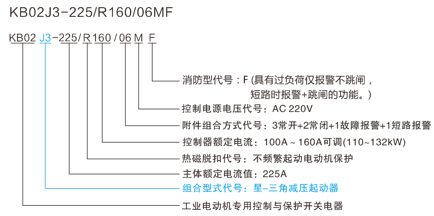 適用于電動機星-三角減壓起動的控制與保護,以KB02產品作為主開關,與塑殼斷路器、可逆接觸器、時間繼電器、電氣聯鎖及控制回路組合構成星-三角減壓起動的控制與保護裝置。
