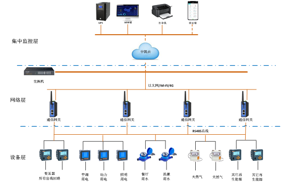 中凱能耗監控系統基于中凱云平臺,現場能耗監測設備進行能耗數據采集,通過智能網關組網,將數據上傳至中凱云平臺。web端及移動端app通過訪問云服務器同步數據,監控系統實現數據監測、分析、評估等功能。
