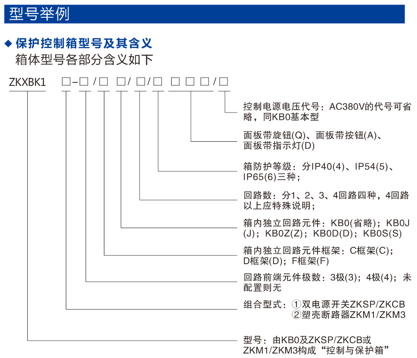 其以KB0作為主開關,配用不同的防護等級箱體,可構成防護等級為IP40、IP54、IP65等多種等級的保護控制箱ZKXBK1,適用于戶外以及遠程單獨負載的控制與保護。由KB0、KB0-F、KB0-G、KB0S3、KB0D、KB0N、KB0J、KB0J2、KB0Z等組合構成單回路、多回路等多種形式;根據需要,在箱體面板上可配備選擇開關、旋鈕、按鈕、信號燈等。與傳統的各種保護箱、綜合式、電磁起動器相比,具有體積小、重量輕、操作安全可靠、接線便捷、防護等級高等特點,且可以選擇就地控制、遠程控制和二者兼有的方式進行操作,是替代傳統產品的極佳選擇。